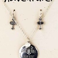 Silver tone chain holds a hammered silver medallion stamped and adorned by a touch of bling and a cross. Necklace measures 20? with lobster claw clasp and extension. Matching cross earrings on hypoallergenic ear wires. Earring measures .5″ and pendant measures 1″. Sets come on a 3.5″ x 4.25″ Adventure! Card