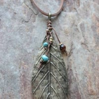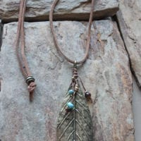 Handcrafted by artisans from the Black Hills of South Dakota. A metal pendant 1.25″ by 4″on an adjustable 30″ suede cord with magnesite turquoise and tiger eye charms. The leaf symbolizes happiness and growth. Each piece is unique and may vary slightly. Pair with matching earrings AE302.