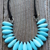 Handcrafted by artisans from the Black Hills of South Dakota. Semi-circle of 1″ long slim drop stones separated by black beads, attached with silver rings to a black suede cord. It is believed that this gem helps its wearer to think with clarity. Measures 21″ including a 4″ extender and lobster claw clasp. Each piece is unique and may vary slightly. Pair with earrings CE886.