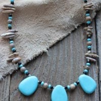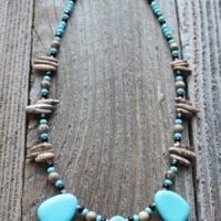 Handcrafted by artisans from the Black Hills of South Dakota. Three triangular stones .75″ by .75″ on a single strand with alternating jasper, silver, teal and black beads. Together these stones create a strong connection to the earth. Measures 20″ including a 4″ extender and lobster claw clasp. Each piece is unique and may vary slightly. Pair with earrings CE917.