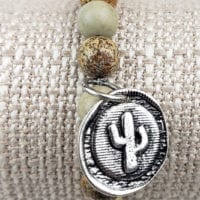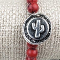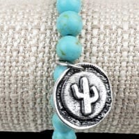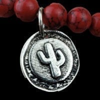A simple strand of beads finished with a 1″ in diameter stamped silver Cactus charm. Color choices Blue, Red or Turquoise. One size fits most.