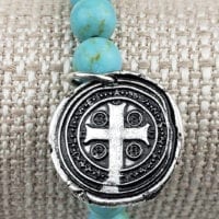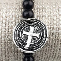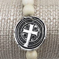 A simple strand of beads finished with a 1″ in diameter stamped silver Saint Benedict charm. Color choices Black, Turquoise or Natural. One size fits most.