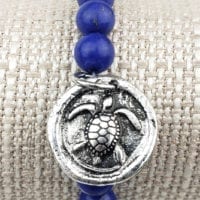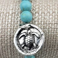 A simple strand of beads finished with a 1″ in diameter stamped silver Sea Turtle charm. Color choices Black, Red or Turquoise. One size fits most.