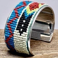 The Native American inspired design showcases a feather and zigzag pattern. Colors are cream, black, blue, yellow and red. Measures 2.5″ in diameter. One size fits all.