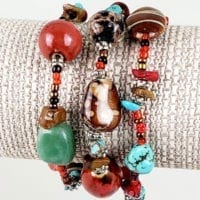 Colorful combinations of stones and beads of glass, porcelain, aventurine, coral, mag turquoise and tiger-eye on 3 strands. Wear one, two or all three. One size fits most.