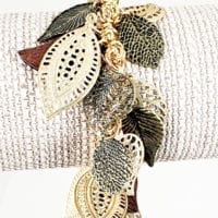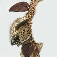 Single strand with metallic shades of gold beads and autumn colored metal and wooden leaves. One size fits most.