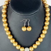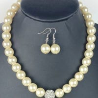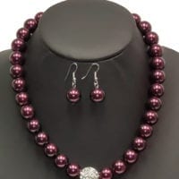 Single strand of faux pearls with a rhinestone globe at the center. Necklace measures 20″ with lobster claw clasp and extension chain. Matching earring measures .5″ from base of the hypoallergenic ear wires to bottom of earring ES1020Wÿ- White Pearls and Rhinestones; ES1020B- Burgundy Pearls and Rhinestones; ES1020G – Gold Pearls and Rhinestones