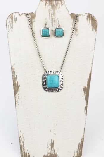 Spruce up your look with a necklace and earring combo. The simple silver unique necklace measures 20 inches with a two-inch extender and mag turquoise stones. The earrings are .75″ long from the bottom of the ear wire.