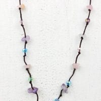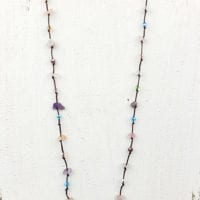 A string of amethyst and crystal gems and beads makes up the necklace. Slip-on necklace measures 39″. Matched with hypoallergenic ear wire holding gems which measures approximately 0.25″ but may vary due to gem