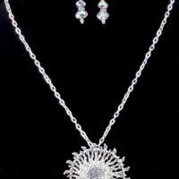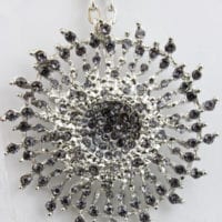 A cascade of black and silver crystals surround a pendant with a stunning starburst design on a silver chain. Necklace measures 26.5″ with extender chain and lobster claw clasp. Faceted crystal ball drop earrings on hypoallergenic ear wires