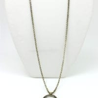 Spearhead shaped pendant with cutout and abstract design on a gold tone circle link chain. Necklace measures 27″ with lobster claw clasp and extension. Matching antiqued coin earrings on hypoallergenic ear wires