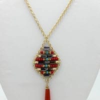 Rounded diamond shaped pendant adorned with graduating rows of red, gold, black and silver beads in the center and a large orange polished teardrop at the bottom. Bright gold tone necklace measures 24″ with lobster claw clasp and extension. Matching rhinestone stud earrings on hypoallergenic posts