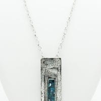 Hammered silver tone rectangle pendant with crystals embedded in blue resin center. Necklace measures 28″ with lobster claw clasp and extension chain. Matching diamond-shaped hammered metal earrings on hypoallergenic ear wires
