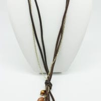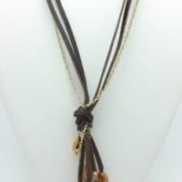This multi-strand leather and chain necklace has a tie at the center with faceted glass dangling beads. Necklace measures 26″ with lobster claw clasp and extension. Matching earrings on hypoallergenic ear wires