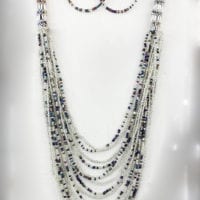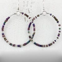 Fifteen strands of clear and oil slick beads finished with silver and purple wrapping. Slip-on style necklace measures 31″. Silver hypoallergenic ear wires hold hoops of clear and oil slick beads