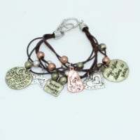 Charms of gold, brass, and silver with inspirational messages and accent beads on 6.5″ brown cord. Finished with a silver tone toggle clasp. One size fits most