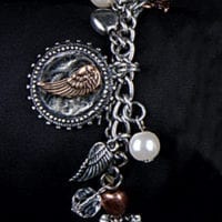 Angel wings, charms and pearls hanging from silver chain on a stretch strand. One size fits most.