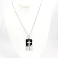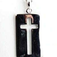 A delicate silvertone chain holds a rectangular pendant with a cut out cross. Great for layering with other inspirational items. Necklace measures 18″ with lobster claw clasp and extension
