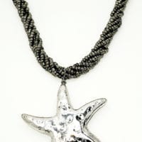 Six strands of silver glass beads twisted to form a chain supporting a silver starfish. Necklace measures 20″ and has a button closure. Handcrafted by artisans from the Black Hills of South Dakota.