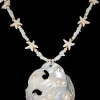 Blends of tan, cream and white beads with copper accents and shell starfish with a pearl blister half-shell pendant. Necklace measures 20.5″ including antiqued brass lobster claw clasp and gold extension. Handcrafted by artisans from the Black Hills of South Dakota.