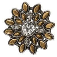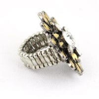 Antiqued silvertone setting holding brushed and polished goldtone and silvertone metal cut into marquis shapes and rhinestones. This ring has a comfortable stretch band and will fit any size.