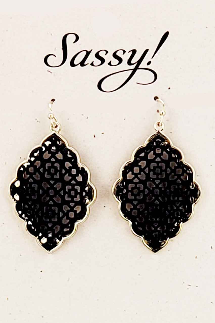 Diamond shaped scalloped frame with black lattice center. On goldtone hypoallergenic french ear wires, earring measures 1″ wide by 1.5″ long. Comes on a 3.5×4.25″ Sassy! Card