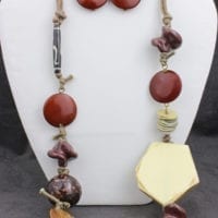 Two leather strands are tied into a single strand of beads varying in size, shape and length. Beads are tied to the leatherette strand and made of shell, wood, designer beads and bone. Necklace measures 31.5″ with extender and lobster claw clasp. Matching maroon coin drop earrings on hypoallergenic ear wires