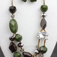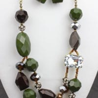 Large faceted brown and olive-green beads accented withÿa large faceted rhinestone combined on a single strand. Necklace is 22″ with lobster claw clasp and extender. Matching faceted olive earrings on hypoallergenic ear wires